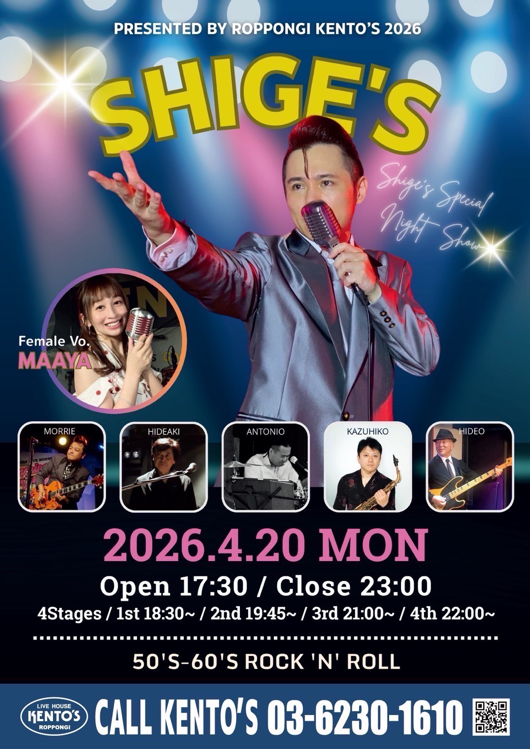 SHIGE'S NIGHT 2026.04.20 最終更新日時 : 2026.04.19 admin 日時2026年4月20日(月) 開場 17:30会場六本木ケントス→website住所東京都港区六本木4丁目1−16 六本木ハイツ B1電話03-6230-1610